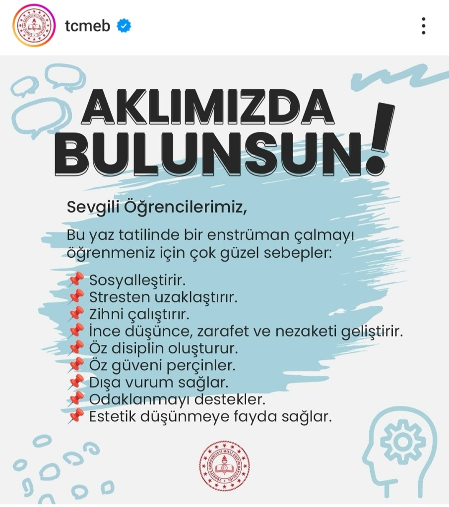Bugün Bakanlığımız tarafından yapılan bir paylaşımda, enstrüman çalmanın faydalarından bahsedildi. Gerçekten de, müzik eğitimi ve enstrüman çalmanın çocuklar üzerindeki olumlu etkileri yadsınamaz. Ancak burada önemli bir soruna dikkat çekmek istiyorum: Enstrüman eğitimi ve sanatsal etkinlikler, ne yazık ki birçok aile için büyük bir mali yük oluşturuyor. Peki, bu durum nasıl değiştirilebilir?